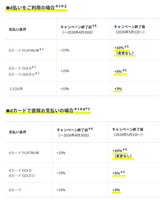 これは、ahamoだけでなくドコモポイ活のポイント還元キャンペーンも同時に終了となり、今後はdカードのグレードによって還元率が変わるようになります。なので、dカードプラチナを使っている人には関係ない話になります。また、上限ポイントの変更はありませんので、例えばdカードゴールドを使っている方であれば還元率が10%が5%になっても上限に達するぐらい使っている方は関係なく上限までポイントがもらえます。
