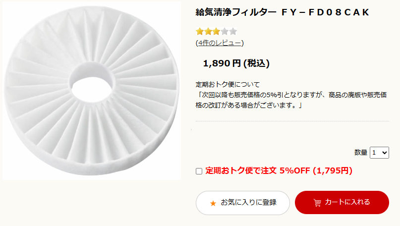 その給気口用の給気清掃フィルターの品番は、FY-FD08CAK(微小粒子用フィルター)でヘーベリアンネットで見ると、以前は1個1,700円(税込)だったものが、2024年12月の時点では1,890円(税込)と値上がりしていました。最近も気になってチェックしてみましたがやはり税込1,890円でした(2026年1月時点)